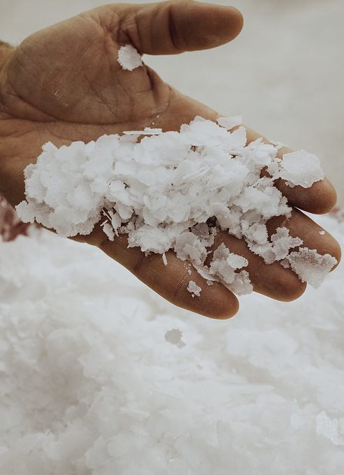 Lors du processus d’évaporation, l’intensité du soleil définit la forme des cristaux de sel (la température détermine la vitesse du processus de séchage et de cristallisation du sel). De ce fait, la saline n’est ouverte que pendant les mois d’été. Le vent quant à lui aide à façonner les cristaux de sel, donnant leur forme aux différents types de sel de source Ancestral, dont leurs fameux « flocons », dont la récolte est particulièrement délicate. Croquants, visuellement légers mais bien présents, ils exhaustent les saveurs, sans dessécher (fort pouvoir de dilution).